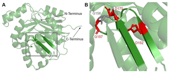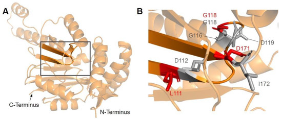 Motif post-I (V171 to D175) is part of the second β-strand that contains a short stretch of hydrophobic residues followed by a highly conserved acidic residue (Figure 6A) [65]. The acidic residue in E. coli UbiG, D85 (D175 in humans) was shown to form hydrogen bonds with the O2′ and O3′ hydroxyl groups on the ribose ring of AdoHcy in the crystal structure of UbiG (PDB: 5DPM), while residue M86 (P176 in humans) immediately following motif post-I interacts with the adenine ring [46]. D175N is the only SNV of interest in this region (Figure 3 and Figure 6B). This variant was classified as structurally damaging by Missense3D due to the replacement of a buried charge, which may disrupt the aforementioned interactions with the ribose ring.