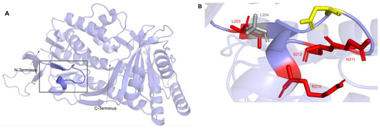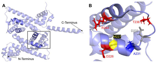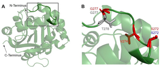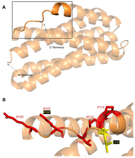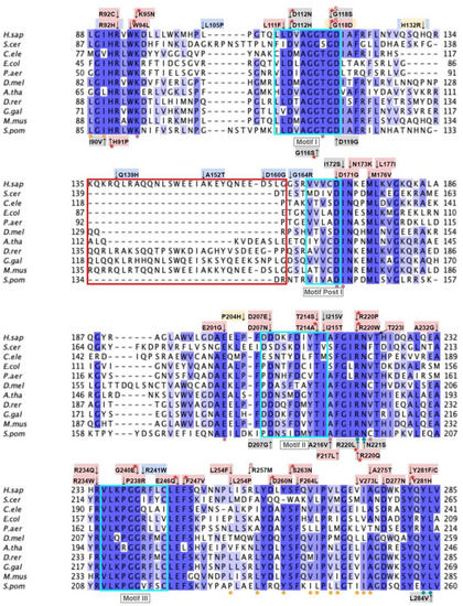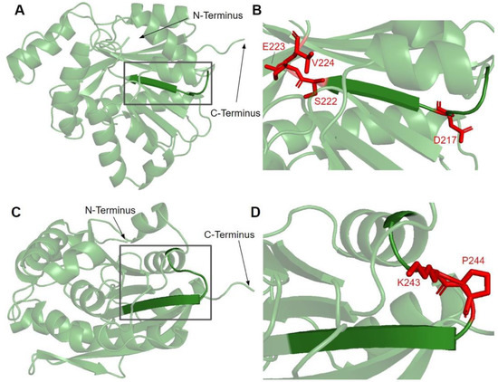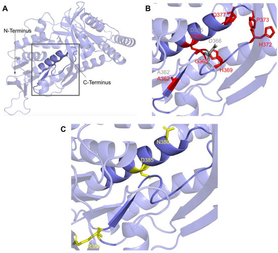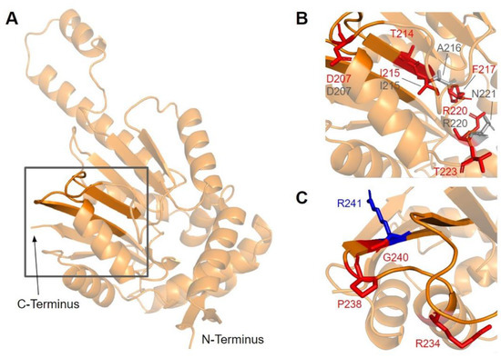Motif III (V235 to C244) and the residues preceding it are located in a coil that becomes β-strand five (Figure 16A). The residues in this coil are responsible for aligning the residues in β5 and the active site [65]. From gnomAD, we identified five SNVs of interest spanning four distinct amino acid positions in this region (Figure 12 and Figure 16C). They are R234Q, R234W, P238R, G240E, and R241W, all of which are highly conserved, with the exception of R241W, which is a frequent polymorphism (allele frequency of 4.21 × 10−4). Only G240E was classified as damaging by Missense3D.