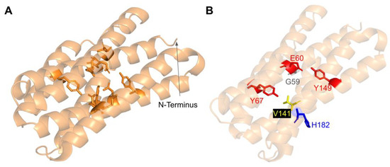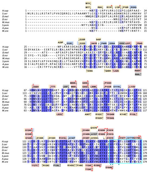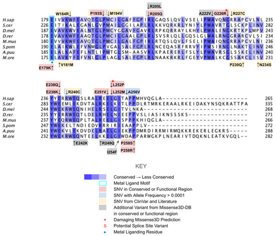 There are four SNVs reported in Missense3D-DB that occur at highly conserved residues within the metal-liganding motif: D164N, H167Y, G178E, and E179K (Figure 11B). Of these, D164, H167, and E179 correspond to residues predicted to ligand the metal ion. D164 is proposed to be analogous to the Mg2+ ion-liganding D121 in Alr8543 (Figure A2). H167 is proposed to be analogous to H120 in Alr8543, which stabilizes interactions with E136 that ligands the Mg2+ ion. E179 is proposed to be analogous to E136, which ligands the second Mg2+ ion in Alr8543 (Figure A2). A homologous point mutation of E179K in Coq4 of S. cerevisiae was unable to form the high molecular mass CoQ synthome [47]. Three SNVs in this region, D164N, H167Y, and G178E, were identified by Missense3D as being structurally damaging. None of these mutations have a reported clinical association on ClinVar.