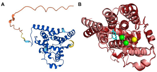 Comparison of the COQ4 AlphaFold model and the structure of Alr8543. (A) AlphaFold model of single chain of COQ4. Model color corresponds to model confidence as described in Figure 4. Figure was generated by the AlphaFold Protein Structure Database; adapted with permission from [39,54]. (B) Structural alignment of the human COQ4 AlphaFold model (shown in dark red) and Chain B of the crystal structure of Alr8543 protein (shown in salmon, PDB: 6E12) in complex with oleic acid (shown in cyan), Mg2+ (shown in green), and Cl− (shown in yellow). Residues 1–44 of the AlphaFold model were omitted due to disordered structure.