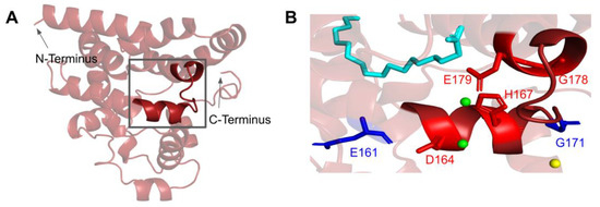 SNVs found in the putative COQ4 metal-liganding motif. (A) The metal-liganding motif (encompassing residues H163 to E179) is highlighted in red on the COQ4 model. (B) Locations of SNVs are depicted. Structural alignment of Alr8543 and COQ4 identifies the metal-liganding motifs in COQ4. Metal ions and oleic acid were obtained from this structural alignment. Residues are colored according to their corresponding SNVs in Figure 9. Mg2+ ions are designated as green spheres and Cl− in yellow. Oleic acid is represented by the cyan structure.