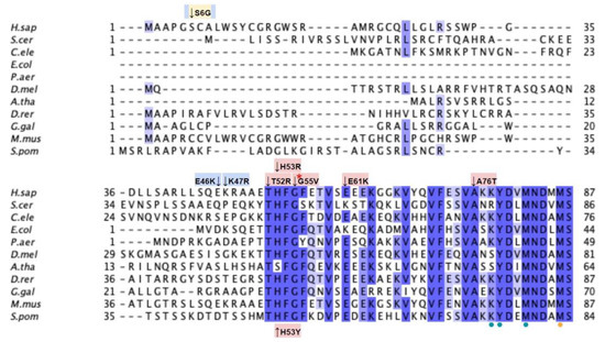 Labeled and annotated multiple sequence alignment of COQ4. Amino acid sequences of COQ4 were analyzed as described in Materials and Methods and include Homo sapiens (NCBI accession number NP_057119.3) and homologs in Saccharomyces cerevisiae (NP_010490.1), Drosophila melanogaster (NP_730270.1), Danio rerio (NP_001108192.1), Mus musculus (NP_848808.1), Schizosaccharomyces pombe (NP_593130.1), Aspergillus puulaauensis (XP_041555109.1), and Marasmius oreades (XP_043005754.1). See KEY for descriptions of the figure annotations. The metal ligand motif is boxed in cyan, and putative residues that ligand the metal ions are denoted by a blue dot, data from [47].