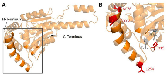 The dimerization interface, as determined from the crystal structures of the yeast Coq5 dimer (PDB: 4OBX and 4OBW), consists of hydrophobic residues homologous to M86, L88, I90, L254, L258, Y262, V266, I267, V269, L270, V273, I274, A275, T315, and I318 [48]. We identified a total of seven SNVs spanning six unique amino acid positions (Figure 17A). Among them, L254F, L254P, V273L, A275T, and T315I were found in gnomAD, while I90V and I318V were found in Missense3D-DB (Figure 17B). None of these variants were flagged as damaging by Missense3D, as the mutant residues were often hydrophobic. It is worth noting that all seven SNVs would appear as surface residues in the COQ5 model, which does not include an oligomeric structure. The effectiveness of Missense3D is limited in this region; thus, we have also provided the SIFT and Polyphen-2 classifications (Supplemental Table S1).