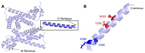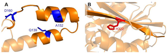 Two additional regions on COQ5 are worth noting. The first is an insert roughly located at residues K135 to G163, which is found exclusively in vertebrate species. A BLAST search comprising the amino acid sequence of this region gave no significant hits [84]. Three SNVs with allele frequency larger than 1.00 × 10−4 are found in this region: Q139H, A152T, and D160G (Figure 18A). A152T was estimated to have an allele frequency of 1.18 × 10−1 by gnomAD, the most common among all missense SNVs found in the COQ5 coding region. While none of these variants were classified as structurally damaging by Missense3D, this region may have evolved new functions, such as protein-protein interactions, that may be affected by these mutations. The second region of interest is the C-terminus of COQ5. Previous studies in yeast have identified a Coq5 point mutant located four residues away from the C-terminus. This mutant resulted in a partially active enzyme that resulted in a decrease in the steady-state levels of Coq3, Coq4, and Coq5, as well as respiratory deficiency [80]. The underlying cause of this phenotype is unclear, although it does suggest that the C-terminus of COQ5 may play a key role in stabilizing Coq5, whether it be through residue-residue interactions or some other means. Two SNVs, H322N and H322D, are found in this region, located just six amino acids away from the C-terminus (Figure 18B). Residue H322 was predicted to interact with Q294 by Missense3D. Both variants were classified as damaging, for reasons related to the loss of buried charges and hydrogen-bonding interactions.