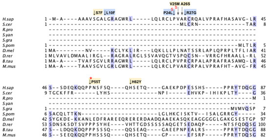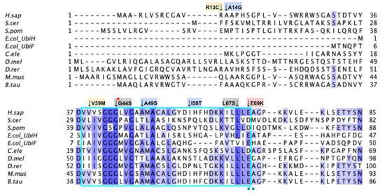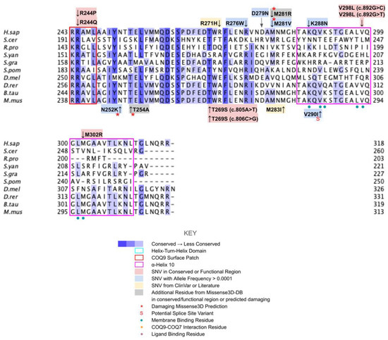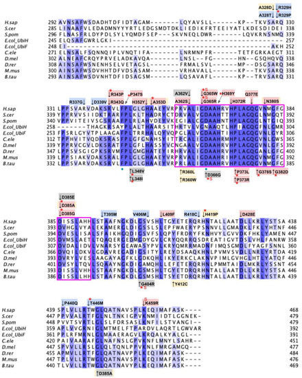 All human COQ polypeptide and orthologous sequences were obtained from NCBI GenBank Release 246.0 [42]. Multiple sequence alignments were generated using the ClustalW package of Clustal Omega [43] and visualized with Jalview2 [44]. Residues were classified as highly conserved if the percent agreement at that position was higher than 80%, as calculated by the built-in feature of Jalview and indicated by a dark blue shading in the sequence alignment. Prior biochemical characterization and crystal structure of Escherichia coli ubiquinone biosynthesis O-methyltransferase UbiG (the COQ3 ortholog) was used to determine the functional regions in human COQ3 (PDB: 4KDC and 5DPM) [45,46]. Molecular genetic analyses of S. cerevisiae Coq4 were used to determine the potential zinc-liganding residues in human COQ4 [47]. Apoenzyme (apo; PDB: 4OBX) and AdoMet-bound (PDB: 4OBW) form of S. cerevisiae Coq5 crystal structures were used to determine homologous residue functionality in human COQ5 [48]. Functional residues in human COQ6 were determined using an S. cerevisiae Coq6 model [49]. Prior biochemical characterization, a structural model, and a recent structure of human COQ7 were used to identify the functional regions of COQ7 [50,51,52]. Prior biochemical characterization, crystal structures, and molecular dynamics simulations were used to outline the functional residues in COQ9 (PDB: 6AWL and 6DEW) [50,52].