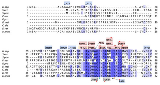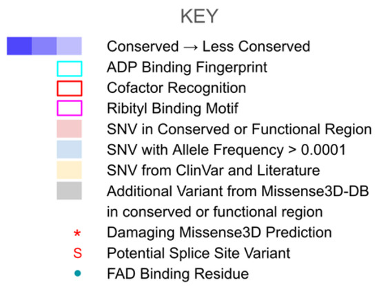 Human SNVs occurring in the canonical transcripts, as reported in NCBI RefSeq [53] for COQ3–COQ7 and COQ9, were gathered from gnomAD v2.1.1 [36], NCBI ClinVar [35], Missense3D-DB v1.5.1 [37], and available literature. Only SNVs that resulted in a missense variant were analyzed. In addition, a filter was applied to retain variants that occur in highly conserved (see Section 2.1) or functional amino acid positions. Variants documented in the ClinVar database or literature, as well as variants with an allele frequency larger than 1.00 × 10−4 as reported in gnomAD v2.1.1 (labeled as “Frequent Polymorphisms”), were also included in our analysis. Finally, exonic variants that are within two nucleotides of a splice site were included as variants of potential interest. Since the Missense3D-DB had already published variant classification using the crystal structure of COQ9, any variant that was reported as structurally damaging in the database was also included in our analysis, regardless of amino acid position or conservation.