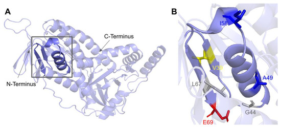 SNVs found in the COQ5 dimerization interface. (A) The dimerization interface of COQ5 largely consists of hydrophobic residues located on the α6 helix (left highlight). The first 47 residues were truncated for simplicity. (B) Locations of SNVs are depicted. Residues are colored according to their corresponding SNVs in Figure 12.