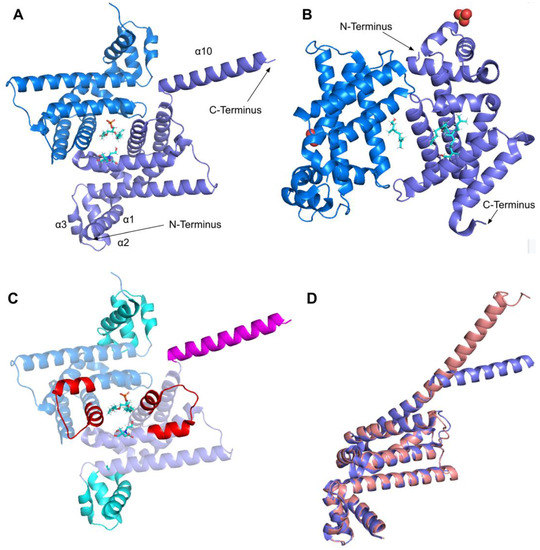 The human COQ4 model was obtained from the AlphaFold Protein Structure Database (Figure 10A) [39,54]. The per-residue model confidence is shown in Figure 10A. A structural alignment of the human COQ4 AlphaFold model with the PDB 6E12 structure of the Alr8543 polypeptide, a COQ4 homolog from Nostoc sp., is shown in Figure 10B.