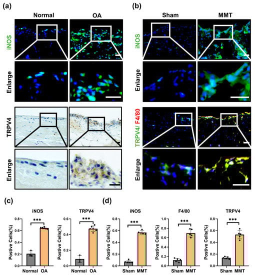 To investigate whether TRPV4 participates in M1 macrophage polarization and OA progression. We investigated the expression of TRPV4 and an M1 macrophage marker (inducible nitric oxide synthase, iNOS) in the human and rat OA model (MMT-induced OA rat model) synovium. Compared to the normal synovium, the quantity of iNOS-positive cells was greatly elevated in OA humans (Figure 1a,c). Furthermore, with the upregulated infiltration of M1 macrophages, the rate of TRPV4-positive cells was considerably increased in the synovium of OA humans (Figure 1a,c). Similar to the human OA synovium, the infiltration of M1 macrophages (iNOS+) was aggravated in the synovium of the MMT groups, accompanied by a considerably higher proportion of TRPV4-positive cells (Figure 1b,d). F4/80, as a marker of macrophages, has been widely used in studies about macrophages [23]. Of note, TRPV4 was located mostly in the accumulated macrophages, with colocalization of TRPV4 and F4/80 (Figure 1b). These findings implied that M1 macrophages accumulate accompanied by dramatically elevated TRPV4 expression in OA synovium.