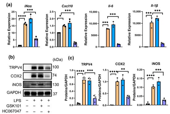 The antibodies used were: rabbit anti-TRPV4 (#ab39260, Abcam, Cambridge, Britain); rabbit anti-iNOS (#13120, Cell Signaling Technology, Danvers, MA, USA); mouse anti-F4/80 (#sc-377009, Santa Cruz, Santa Cruz, CA, USA); rabbit anti-COX2 (#ab15191, Abcam, Cambridge, Britain); rabbit anti-GAPDH (#8884, Cell Signaling Technology, Danvers, MA, USA); rabbit anti-NLRP3 (#13158, Cell Signaling Technology, Danvers, MA, USA); rabbit anti-CASPASE-1 (#22915-1-AP, Proteintech, Wuhan, China); and rabbit anti-ASC (#10500-1-AP, Proteintech, Wuhan, China).