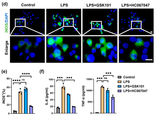 HC067047, as a potent (IC50 = 17 nmol/L) and selective TRPV4 antagonist, could reversibly inhibit currents through TRPV4 [24], and GSK101 is a selective agonist of TRPV4 [25]. To uncover whether targeting TRPV4 can inhibit M1 macrophage polarization in vitro, RAW264.7 cells were stimulated by 100 ng/mL LPS, a model of M1 macrophages, with or without 10 μmol/L HC067047 or 5 μmol/L GSK101. Compared to vehicle-treated cells, iNos, Il-6, Cxcl10, and Il-1β mRNA levels (Figure 2a) and iNOS, COX2, and TRPV4 protein levels (Figure 2b,c) were significantly elevated in LPS-treated cells (M1 macrophages). This finding indicated that TRPV4 participates in LPS-induced M1 macrophage polarization. Furthermore, qPCR and Western blot analysis demonstrated that suppression of TRPV4 by HC067047 result in a considerable decrease in the mRNA and protein levels of M1 phenotypic markers (Figure 2a–c), but activation of TRPV4 by GSK101 did not change the phenotype of M1 macrophages (Figure 2a–c). Immunofluorescence results also showed reduced expression of iNOS in HC067047-treated M1 macrophages (Figure 2d,e). At the same time, ELISA analysis detected that the protein levels of IL-6 and TNF-α in M1 macrophage supernatants were dramatically decreased when TRPV4 was inhibited. (Figure 2f). All of these results highlighted that TRPV4 inhibition suppressed the generation of proinflammatory factors in LPS-treated macrophages (M1 macrophages).