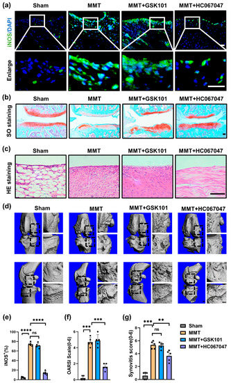 To study the role of TRPV4 in M1 synovial macrophages in OA, MMT surgery was used to induce a rat OA model [26], and inhibition of TRPV4 alleviated OA and inhibited M1 synovial macrophage polarization by intra-articular administration of HC067047. After 8 w of MMT surgery, mice acquired the pathological characteristics of OA, involving breakdown of cartilage, inflammation of the synovium (synovitis), and formation of osteophytes (Figure 3b–d). However, compared to the MMT group, the MMT + HC067047 group showed less infiltration of M1 macrophages (iNOS+) in the synovium (Figure 3a,e), indicating that TRPV4 inhibition suppresses M1 synovial macrophage polarization in vitro. Furthermore, consistent with the decrease in M1 macrophages, cell infiltration of the synovium was also reduced following HC067047 treatment (Figure 3c). Analysis of representative images of the cartilage extracellular matrix revealed that inhibition of TRPV4 could delay the breakdown of cartilage in the MMT-induced OA rat model (Figure 3b). The synovitis score and OARIS scores both decreased significantly (Figure 3f,g). Moreover, osteophytes, a major feature of OA progression [27], decreased significantly after HC067047 administration (Figure 3d). In conclusion, TRPV4 suppression caused by intra-articular administration of HC067047 could prevent M1 synovial macrophage polarization and OA development in vivo.