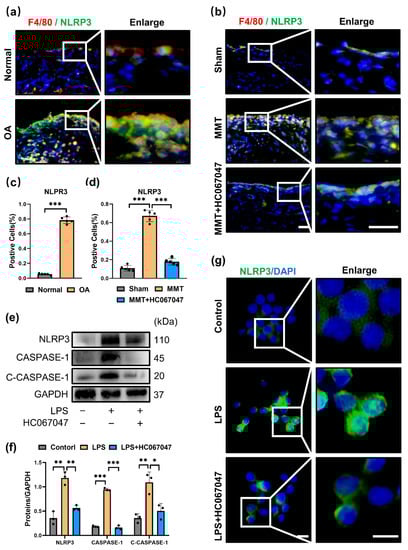 To further investigate the underlying mechanism of TRPV4 on M1 macrophage polarization. We evaluated whether blockade of TRPV4 can inhibit the NLRP3 inflammasome, both priming and activating signals are required, which is the main characteristic of the M1 macrophage phenotype [28,29]. Compared to the normal group, NLRP3 was significantly elevated in the synovium of human OA and mostly colocalized with macrophage markers (F4/80) (Figure 4a,c). Consistent with human OA synovium, NLRP3 colocalized with macrophages (F4/80+) was markedly increased (Figure 4b,d) in the MMT group. However, blockade of TRPV4 by injection of HC067047 showed that the expression of NLRP3 in synovial macrophages was markedly reduced (Figure 4b,d).