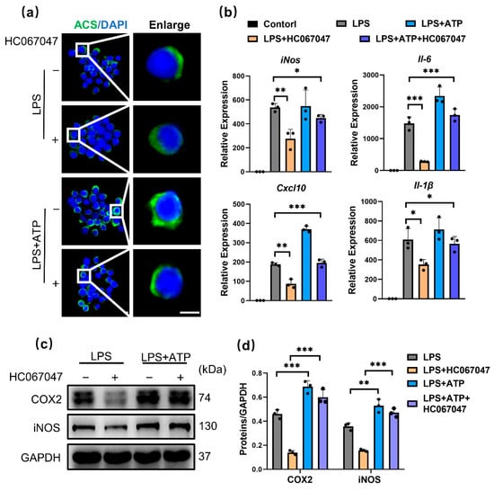 To investigate whether the NLRP3 inflammasome is required for TRPV4-mediated M1 macrophage polarization inhibition, ATP, which is an NLRP3 activator that promotes the flow of potassium ions [32], was used. Immunofluorescence analysis showed that ASC was polarized to one side of the perinuclear area, a feature of NLRP3 activation, in response to ATP stimulation in HC067046-treated M1 macrophages (Figure 5a). This finding indicated that ATP blocked the effect of HC067047 on the inhibition of the NLRP3 inflammasome. In addition, ATP also blocked the impact of HC067047 on suppressing the generation of proinflammatory factors (Figure 5b–d). According to these results, we suggest that TRPV4 suppression decreases M1 macrophage polarization by blocking the NLRP3 signaling pathway.