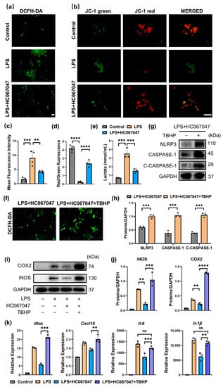 To investigate the effect of ROS on the M1 macrophage polarization and NLRP3 inflammasome activation in vitro, TBHP (tert-butyl hydroperoxide), which promotes mitochondrial ROS production [35], was used in HC067047-treated M1 macrophages. The generation of mitochondrial ROS was significantly enhanced after TBHP treatment (Figure 6f), and the priming and activation of the NLRP3 inflammasome were also elevated following TBHP stimulation (Figure 6g,h). In addition, TBHP markedly increased the protein levels of COX2 and iNOS, and mRNA levels of iNos, Il-6, Cxcl10, and Il-1β. (Figure 6i–k). In summary, these results indicate that ROS mediates the role of HC067047 in inhibiting NLRP3 activation and M1 macrophage polarization.