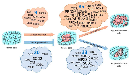 Effects of the overexpression of antioxidant defense genes on the probability of normal cells/tissues malignization and on the aggressiveness of already developed cancer cells/tumors. The font size is proportional to the number of studies that showed the effect of the overexpression of that gene. Numbers in blue show total numbers of studies in each group.