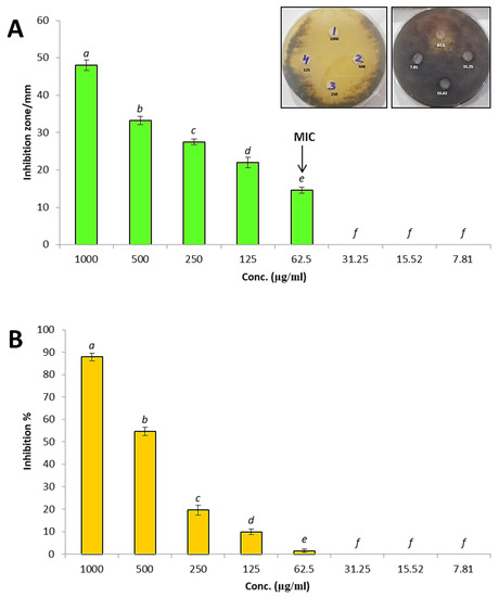 Antifungal activity of biosynthesized silica nanoparticles was carried out using well diffusion method. A. solani was inoculated on PDA broth medium, and then incubated at 28 ± 2 °C for 3–5 days. Fungal inoculum of A. solani was spread on the surface of PDA plates. Then, wells with 8 mm diameter were made using sterile cork-borer on each agar plate (90 mm). The wells were filled with 100 µL of different concentrations of SiO2-NPs (7.81–1000 µg/mL) individually with three replicates. The culture plates were incubated at 25 °C for 7 days and the zones of inhibition were observed and measured. Radial growth of A. solani was evaluated at different concentrations of SiO2-NPs (7.81, 15.62, 31.25, 62.5, 125, 250, 500 and 1000 µg/mL). Inhibition percentage of pathogen growth was calculated using the following Equation (2):