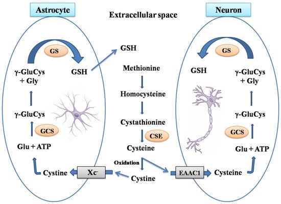 Astrocytes have higher GSH concentration compared to neurons, and both have a differential preference for the precursors of GSH synthesis. Secretion of GSH into the extracellular space by astrocytes provides GSH precursors to neurons [32] (Figure 1). In addition, cysteine transport to the cell also occurs differently in neurons and astrocytes. Neurons use excitatory aminoacid transporter (EAATs) to take up cysteine from extracellular space, while cystine/glutamate transporter (Xc-) mediates transport in astrocytes (Figure 2). Of the five EAATs known to exist, excitatory amino acid carrier 1 (EAAC1) is involved in the neuronal uptake of cysteine [33]. Neurons use extracellular cysteine for GSH synthesis and cannot use oxidized form cystine, unlike astrocytes. Transsulfuration pathways provide intracellular cysteine for GSH synthesis. The majority of GSH synthesized in the liver utilizes the cysteine formed from transsulfuration. The activity of cystathionine-γ-lyase (the rate-limiting enzyme in transsulfuration pathway) in the brain is approximately 1% of the corresponding liver activity [34]. However, astrocytes also depend on transsulfuration pathways for intracellular cysteine availability, while it is nearly absent in neurons. Thus, the availability of cysteine is very critical to neurons that exclusively depend on the extracellular cysteine for GSH synthesis [35].