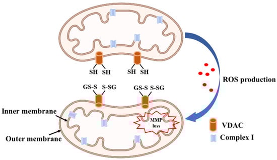 Oxidative stress leads to complex Ⅰ inhibition and mitochondrial membrane potential loss. Protein thiols present in VDAC undergo oxidation leading to increased permeability of transition pore and loss of mitochondrial membrane potential. MMP loss facilitates the release of apoptotic factors such as cytochrome c promoting cell death.
