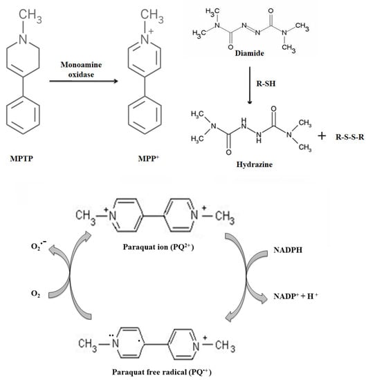 MPTP is the most common neurotoxin used to induce parkinsonism to identify early events in PD pathology [81,82]. MPTP increases the number of reactive oxygen species and lipid peroxidation product and is accompanied by a loss in GSH in both the in vitro and the in vivo mouse model. In vivo administration of MPTP results in the lowering of GSH along with increased ROS in midbrain and striatum [83]. MPP+, an active metabolite of MPTP (Figure 6) administration inhibits mitochondrial complex Ⅰ activity [84] and is confined to dopaminergic cells which, in part, explains their susceptibility towards oxidative damage in PD [85].