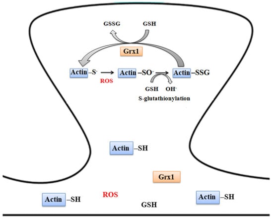 Schematic of actin glutathionylation in dendritic spines. Actin undergoes oxidative modification at the synapse during oxidative stress potentially affecting its assembly and interactions. S-glutathionylation of actin at Cys-374 residue in the presence of GSH affects its polymerization [119]. Actin-SSG formed is reversed effectively by Grx1 utilizing GSH and reducing equivalents of NADPH.