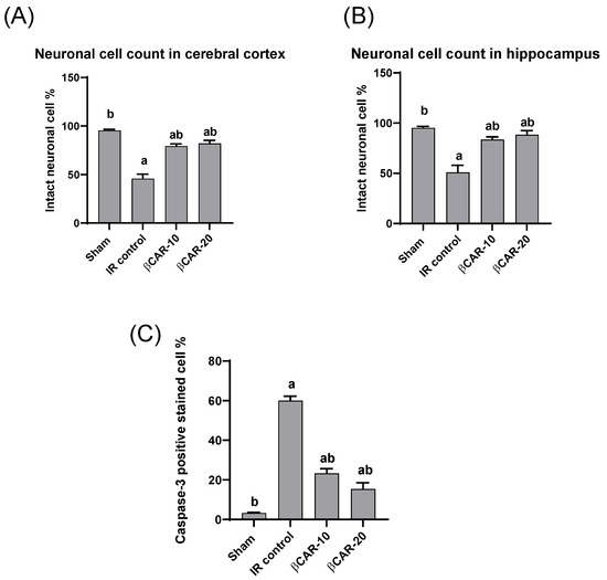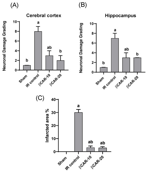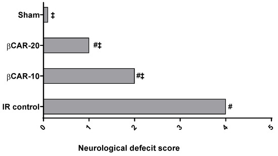 The hippocampus and basal forebrain are the main parts of the brain involved in memory and learning processes. Cognitive impairment could arise when distortion in the function or structure of these brain areas occur [34]. In the current study, the left cerebral I/R model gave rise to increased neurological deficit scores in rats. This finding is supported by previous reports where the neurological deficit score was elevated in the I/R control rats compared to the sham animals [21,35]. Further, neurological deficit scores were significantly lowered in βCAR-10 and βCAR-20 groups compared to the I/R control rats.