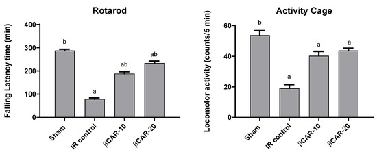 Effect of βCAR on motor coordination (rotarod) and locomotor activity (activity cage) in I/R control rats. a, b denotes significant difference at p ≤ 0.05 against sham and I/R control groups, respectively, (n = 6).