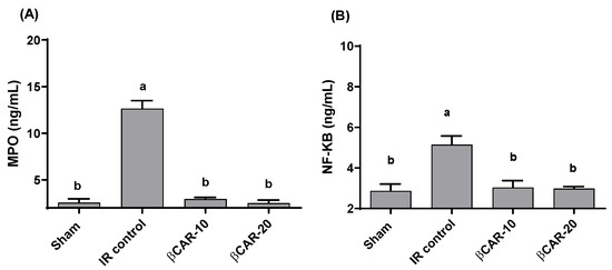 Effect of βCAR on MPO (A) and NF-κB (B) in brains of rats with focal cerebral ischemia-reperfusion. a, b denotes significant difference at p ≤ 0.05 against sham and I/R control groups, respectively, (n = 6).