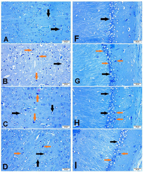 Sections of the left brain lobe were dehydrated and deparaffinized using xylene and then stained with toluidine blue stain [28]. The number of unharmed neuronal cells in correlation to the total number of the neuronal cells was determined under high magnification power (×400). The percentage of intact cells was calculated in both brain cortex and hippocampus using the ImageJ analyzer (software v. 1.41).