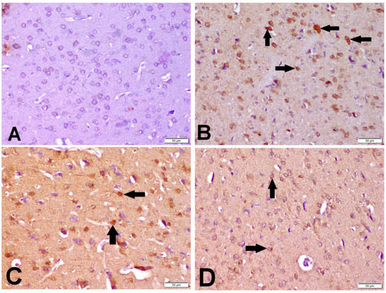 The tissue specimens of all groups were deparaffinized and rehydrated. The antigen retrieval was carried out using 10 mM citrate buffer, pH 6.0 according to the reported method [29]. Mouse monoclonal anti-caspase-3 antibody (sc-56053, Santa Cruz Biotech, Dallas, TX, USA) at 1:50 was added to tissue specimens and incubated overnight in humid space. In negative control slides the primary antisera were omitted with 1 mg/mL BSA (Sigma, Kawasaki, Japan). The tissue sections were thoroughly washed with Tris-buffered saline to remove unconjugated antibodies. After that, the sections were incubated for 10 min with a biotinylated goat anti rabbit and mouse antibody (Thermo Fisher scientific, Waltham, MA, USA), thoroughly washed with TBS, and then DAB (3,3 diaminobenzidine) was added to the sections. Finally, the sections were counterstained with Mayer’s hematoxylin and mounted with DPX. The photographed pictures were analyzed using ImageJ. The percentage of positive immune-staining cells was calculated in 7 microscopic fields/groups in both the brain cortex and hippocampus.