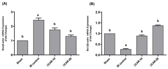 In the current study, we used RT-PCR to compare the mRNA expression of the apoptosis-promoting Bax and the apoptosis-inhibiting Bcl2 in the βCAR-10 and βCAR-20 groups (n = 6) to their expression levels in the sham operation group (n = 6) and the I/R control group (n = 6). When compared to the sham group, the mRNA expression level of Bax in the ischemic side of the brain of the I/R model rats tended to increase (p ≤ 0.05); while there was a decreased trend (p ≤ 0.05) in the expression of Bax in the rats’ ischemic brain tissue in the βCAR-10 and βCAR-20 groups (Figure 9).