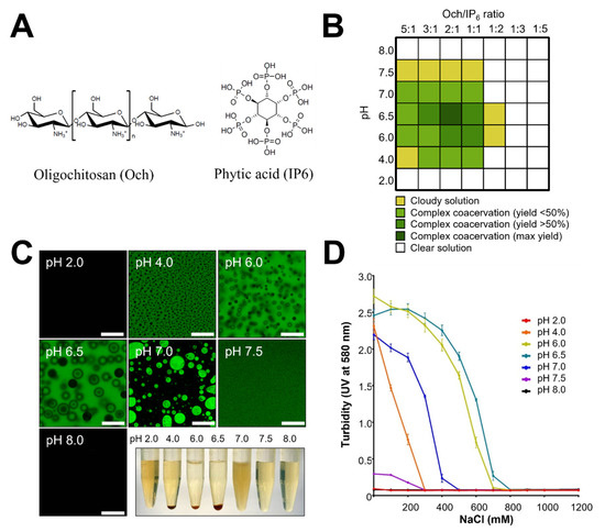 3.1. Formation of a Complex Coacervation Base on Och and IP6 Is pH- and Salt-Dependent