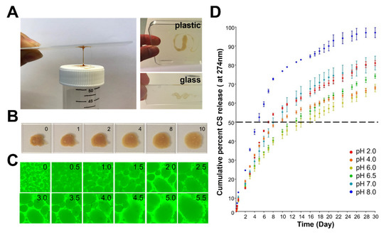 - Bartkowiak, A.; Hunkeler, D. Alginate−Oligochitosan microcapsules: A mechanistic study relating membrane and capsule properties to reaction conditions. Chem. Mater. 1999, 11, 2486–2492. [Google Scholar] [CrossRef]