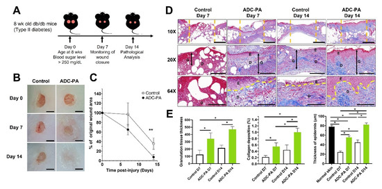 3.6. ADC-PA Facilitates Re-Epithelialization and Accelerates the Wound-Healing Process of Diabetic Mice