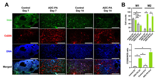 3.7. Treatment with ADC-PA Leads to a Fine Balance between the Numbers of iNOS+CD206- M1 and iNOS-CD206+ M2 Macrophages in Wound Microenvironments