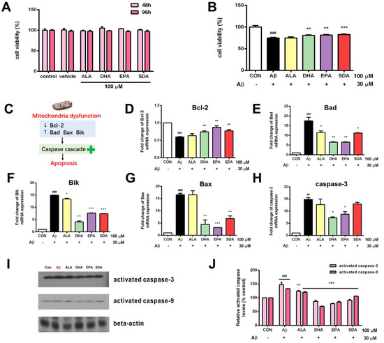 SDA protects against Aβ -induced hippocampal cell death. (A) The viability of H19-7 cells after treatment with ALA, DHA, EPA, SDA, or BSA–ethanol (vehicle) in the concentration of 100 μM for 48 h or 96 h. (B) The viability of H19-7 cells after 48 h of culture in medium enriched with ALA, DHA, EPA, SDA prior to exposure to non-fibrillar Aβ for 24 h. (C) Aβ strongly decreased anti-apoptotic gene Bcl-2 expression and increased the expression of pro-apoptotic genes, caspase-3, Bad, Bax, and Bik. H19-7 cells were pretreated with ALA, DHA, EPA, SDA, or BS–-ethanol vehicle control in the concentration of 100 μM for 48 h, then 30 μM Aβ1-40 was added into the medium for another 24 h incubation. The mRNA expression of anti-apoptotic gene (D) Bcl-2 and pro-apoptotic gene (E) Bad, (F) Bik, (G) Bax, and (H) caspase-3 in H19-7 cells. (I,J) The protein expression of the activated caspase-3 and activated caspase-9 in H19-7 cells. Values were obtained from three independent experiments and were expressed as the means ± SEM; ## p < 0.01, ### p < 0.001, different from BSA–ethanol vehicle-treated control cells; * p < 0.05, ** p < 0.01, *** p < 0.001, different from Aβ1-40-treated cells.