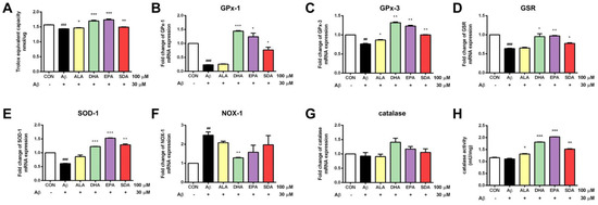 SDA protects against Aβ-induced oxidative stress in rat hippocampal cells. H19-7 cells were pretreated with ALA, DHA, EPA, SDA or BSA–ethanol vehicle control in the concentration of 100 μM for 48 h, then 30 μM Aβ1-40 was added into the medium for another 24 h incubation. (A) Total Anti-Oxidant Capacity, mRNA expression of anti-oxidant gene catalase (B) GPx-1, (C) GPx-3, (D) GSR, (E) SOD-1, (G) catalase and pro-oxidant gene, (F) NOX-1 and (H) catalase activity in H19-7 cells induced by Aβ1-40. Values were obtained from three independent experiments and were expressed as the means ± SEM; ## p < 0.01, ### p < 0.001, different from BSA–ethanol vehicle-treated control cells; * p < 0.05, ** p < 0.01, *** p < 0.001, different from Aβ1-40-treated cells.