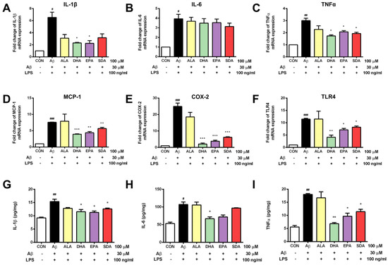 SDA protects against Aβ-induced inflammation in rat hippocampal cells. H19-7 cells were pretreated with ALA, DHA, EPA, SDA, or BSA–ethanol vehicle control in the concentration of 100 μM for 48 h, then 30 μM Aβ1-40 and 100 ng/mL LPS were added into the medium for another 24 h incubation. The release of pro-inflammatory cytokines (A) IL-1β, (B) IL-6, and (C) TNFα and the mRNA expression of proinflammatory mediators (D) IL-1β, (E) IL-6, (F) TNFα, (G) MCP-1, (H) COX-2, and (I) TLR4 in H19-7 cells induced by Aβ1-40 and LPS. Values were obtained from three independent experiments and were expressed as the means ± SEM. # p < 0.05, ## p < 0.01, ### p < 0.001, different from BSA–ethanol vehicle-treated control cells; * p < 0.05, ** p < 0.01, *** p < 0.001, different from Aβ- and LPS-treated cells.