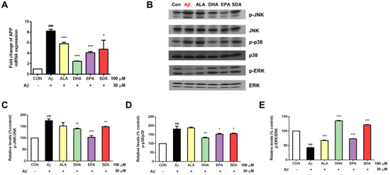 The anti-Aβ effect of SDA involves its inhibition on Aβ synthesis and regulation on MAPK signaling. H19-7 cells were pretreated with ALA, DHA, EPA, SDA, or BSA–ethanol vehicle control in the concentration of 100 μM for 48 h, then 30 μM Aβ1-40 was added into the medium for another 24 h incubation. (A) The mRNA expression of APP. (B) Western blot analysis of MAPK signaling activation. The ratios of (C) p-JNK to JNK, (D) p-p38 to p38 and (E) p-ERK to ERK were determined. Values were obtained from three independent experiments and were expressed as the means ± SEM. ### p < 0.001, different from BSA–ethanol vehicle-treated control cells; * p < 0.05, ** p < 0.01, *** p < 0.001, different from Aβ-treated cells.