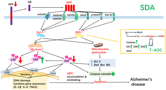 A summary of the neuroprotective effect of SDA on amyloid β-induced neurotoxicity in rat hippocampal cells. SDA was able to regulate expression of apoptotic mediators, improve total anti-oxidant capacity, reduce expression of pro-inflammatory mediators, inhibit expression of the precursor of Aβ, attenuate stress-triggered apoptotic JNK/p38 phosphorylation, and activate survival-related ERK signaling pathway.