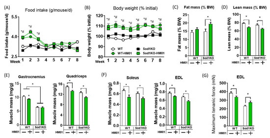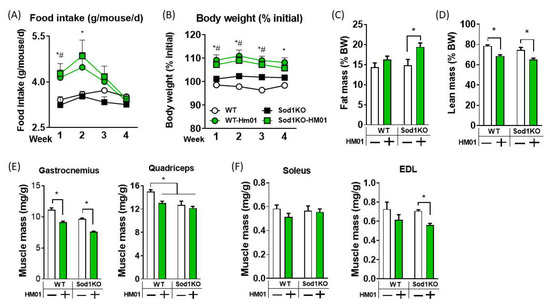 Four-week treatment of HM01 increases food intake transiently but decreases lean body mass and muscle mass. (A) Food consumption during the four-week HM01 treatment. (B) Percent body weight relative to initial over four-week study period. (C,D). % fat mass and % lean mass relative to body weight at study endpoint. (E) Gastrocnemius and quadriceps normalized to body weight. (F) Soleus and extensor digitorum longus normalized to body weight. Two-Way ANOVAs were used to test statistical significance between groups, followed by Tukey post hoc tests. Data are mean ± SEM. p < 0.05. * significant difference between WT and WT-HM01. # Significant difference between Sod1KO and Sod1KO-HM01. Abbreviation: +, treated; −, untreated; EDL, extensor digitorum longus.