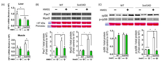 Four-week HM01 treatment abrogates anabolic pathways in Sod1KO. (A) IGF-1 levels in the liver and muscle are significantly decreased after HM01 treatment. (B) Proteins involved in myogenesis, Pax7 and MyoD, are upregulated in Sod1KO muscle. This upregulation is abrogated by HM01 treated Sod1KO group. (C) Ribosomal protein S6 levels were unchanged, but its phosphorylation is significantly upregulated at Ser240/244 sites. HM01 treated mice are lacking this upregulation of the marker for ribosomal protein synthesis. Two-Way ANOVAs were used to test statistical significance between groups, followed by Tukey post hoc tests. Data are mean ± SEM. * p < 0.05.