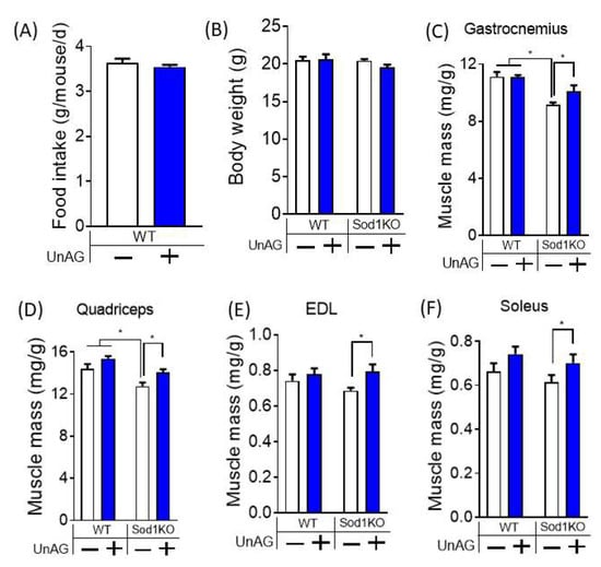 Unacylated ghrelin treatment increases skeletal muscle mass in redox-dependent sarcopenia independent of changes in food consumption or body weight. Unacylated ghrelin does not alter food intake (A) or body (B) of wildtype mice. (C,D) Unacylated ghrelin preserves the loss of muscle mass of gastrocnemius and quadriceps in Sod1KO mice. (E,F) Unacylated ghrelin increases muscle mass of EDL and soleus in Sod1KO mice. Two-Way ANOVAs were used to test statistical significance between groups, followed by Tukey post hoc tests. Data are mean ± SEM. * p < 0.05. Abbreviations: UnAG, unacylated ghrelin; EDL, extensor digitorum longus.
