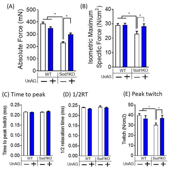 Unacylated ghrelin improves contractile properties of EDL muscle. (A) Isometric maximum specific force, force per cross-sectional area, were significantly decreased in Sod1KO, but fully protected by unacylated ghrelin treatment. (B) Maximum absolute force generation is significantly lower in Sod1KO mice, but partially protected by unacylated ghrelin. (C) Time to reach peak twitch is unchanged by Sod1KO or unacylated ghrelin treatment. (D) Half relaxation time (1/2 RT) did not differ by Sod1 deletion or unacylated ghrelin. (E) Peak twitch is significantly reduced in Sod1KO but preserved by unacylated ghrelin treatment. Two-Way ANOVAs were used to test statistical significance between groups, followed by Tukey post hoc tests. Data are mean ±SEM. * p < 0.05. Abbreviations: UnAG, unacylated ghrelin; EDL, extensor digitorum longus.