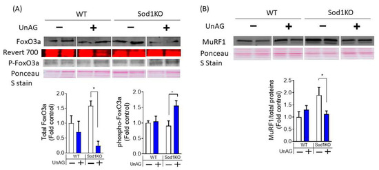 Unacylated ghrelin’s downstream effects in a redox dependent sarcopenia. (A) FoxO3a protein expression is decreased in by unacylated ghrelin in Sod1KO muscle. Phosphorylation of FoxO3a at Ser 253 was upregulated by unacylated ghrelin treatment in Sod1KO. (B) E3 ligase MuRF1 expression is increased in Sod1KO but downregulated by unacylated ghrelin. Two-Way ANOVAs were used to test statistical significance between groups, followed by Tukey post hoc tests. Data are mean ± SEM. * p < 0.05. Abbreviations: UnAG, unacylated ghrelin; FoxO3a, Forkhead box O3a.