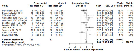 Continuous outcomes, measured on the same scale, are expressed as the mean value and standard deviation, for descriptive purposes. Standardized mean differences (SMD) and the corresponding 95% confidence interval (95% CI) were used to estimate pooled results. The I-square (I2) and Q chi-square tests were performed—according to the Cochrane review guidelines—to evaluate the presence of heterogeneity on the meta-analysis results (when there was a significant heterogeneity with I2 > 50%, random effect modeling was used). Effect sizes are represented by the standardized mean difference, and are presented together with their 95% confidence intervals. SMDs were interpreted as small (0.2–0.5), moderate (0.5–0.8), or large (>0.8), based on [66]. In order to explore possible contributors to the study variance, we investigated the effects of biological and clinical potential confounders on the SMD by univariate meta-regression analysis, reporting a Q chi-square of the moderators’ test (QM). The presence of publication bias was tested using funnel plots adjusted through the “trim and fill” method, as well as Egger’s test. Statistical assessment was two-tailed, and was considered statistically significant at p < 0.05. All analyses were carried out using R version 3.6.2, with the packages metafor and meta (metafor; Statistical program).