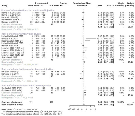 As reported in the flow-chart (Figure 3) there were studies matching the inclusion criteria with regard to animals, treatment, and study design, which were not included in the analysis, as numerical data were not available, but only their graphical representations were. For these reasons, we contacted 170 primary or corresponding authors of these studies by e-mail twice. No additional papers were retrieved from this activity. However, to evaluate whether the exclusion of these studies introduced a selection bias, we performed a sensitivity analysis on a random sample of 10 studies [57,58,59,60,61,62,63,64,65], wherein the numerical values of means, medians, SEM, and SD were extrapolated from the graph. The point estimate of the effect (SMD = 1.89) was very close to the results of the meta-analysis described in the paper, though it was not possible to evaluate the variability of the single studies, since the extrapolation of SEM/SD from the graphs was not always possible/reliable.