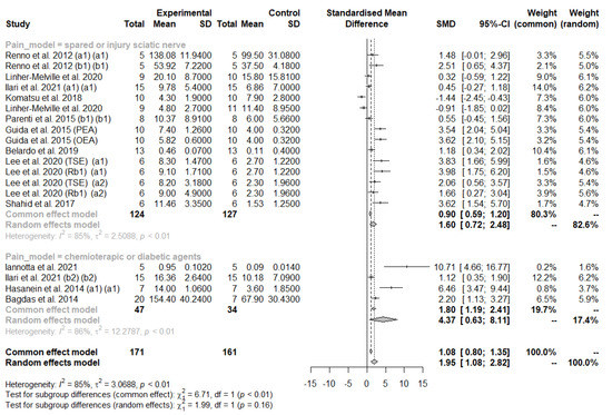 The outcome of the second meta-analysis was the variation of mechanical allodynia and hyperalgesia through paw withdrawal threshold (gr) in the injured paw, comparing different experimental models of neuropathic pain between animals that received pain only (control group) and those that were also treated with natural drugs (experimental group).