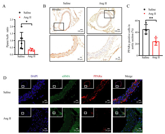 Ppara was decreased in Ang II−induced vascular remodeling. (A) mRNA levels of Ppara in aortas of Ang II infusion WT mice compared with that of saline infusion WT mice (n = 5–6, unpaired t-test, * p < 0.05). (B) Immunohistochemistry staining for PPARα in aortas of Ang II infusion mice and saline infusion mice. (C) Immunohistochemistry analysis of PPARα protein level (n = 4, unpaired t-test, * p < 0.05, ** p < 0.01). (D) Immunofluorescence staining for PPARα in aortas of Ang II infusion mice and saline infusion mice. (n = 3, blue represents DAPI staining, green represents αSMA staining and red represents PPARα staining). Data are means ± SEM. * p < 0.05, ** p < 0.01 between groups.