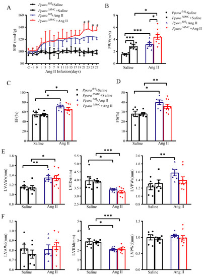 PPARα deficiency in VSMCs aggravated Ang II−induced hypertension and vascular stiffness independent of cardiac function. (A) Systolic blood pressure (SBP) was measured by noninvasive tail–cuff method before and after saline or Ang II infusion (490 ng/kg/day). (B) Pulse wave velocity (PWV) was measured by vascular ultrasound after Saline or Ang II infusion. (C) Ejection fraction (EF) and (D) fractional shortening (FS) were assessed by two-dimensional echocardiography after saline or Ang II infusion. Left ventricular anterior wall (LVAW) thickness, left ventricular internal diameter (LVID), and left ventricular posterior wall (LVPW) thickness at end-systole (s, E) or end-diastole (d, F) are recorded and analyzed (n = 6–9, two-way ANOVA). Data are means ± SEM. * p < 0.05, ** p < 0.01, *** p < 0.01 between groups.